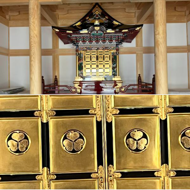 5代将軍綱吉の生母・桂昌院が寄贈されたもので、修理され見違えるほどになりました。三つ葉葵の紋は綱吉公のものだそうです。