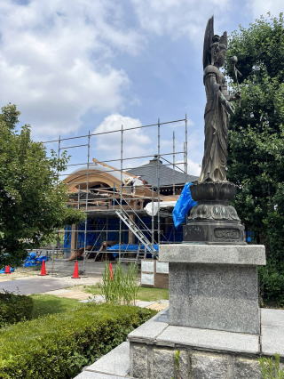 本堂裏にあった開山堂が本堂西側に曳きが終わり、正面には唐破風向拝の工事が進んでいます。9月のお彼岸ころまでに完成予定です。